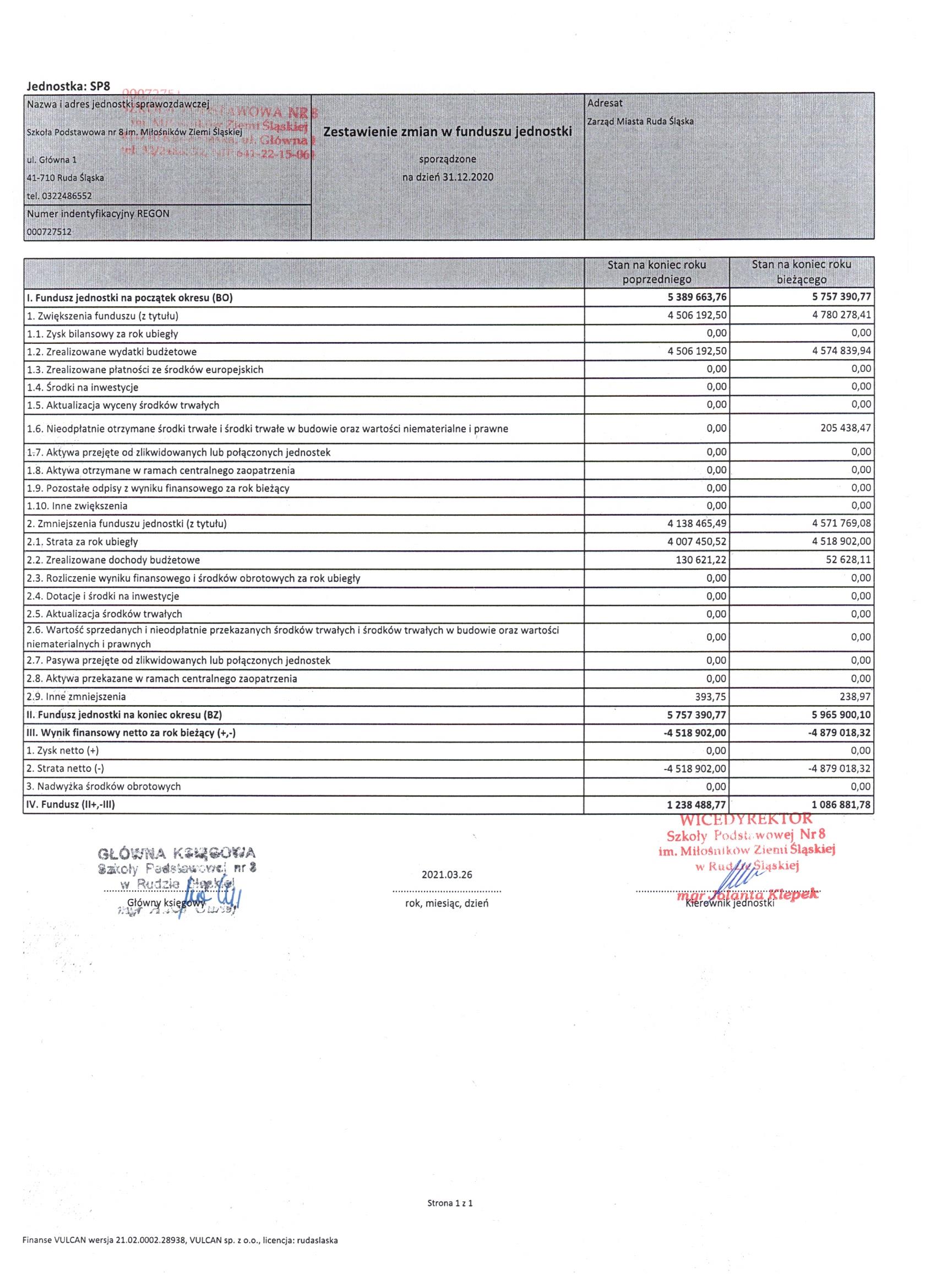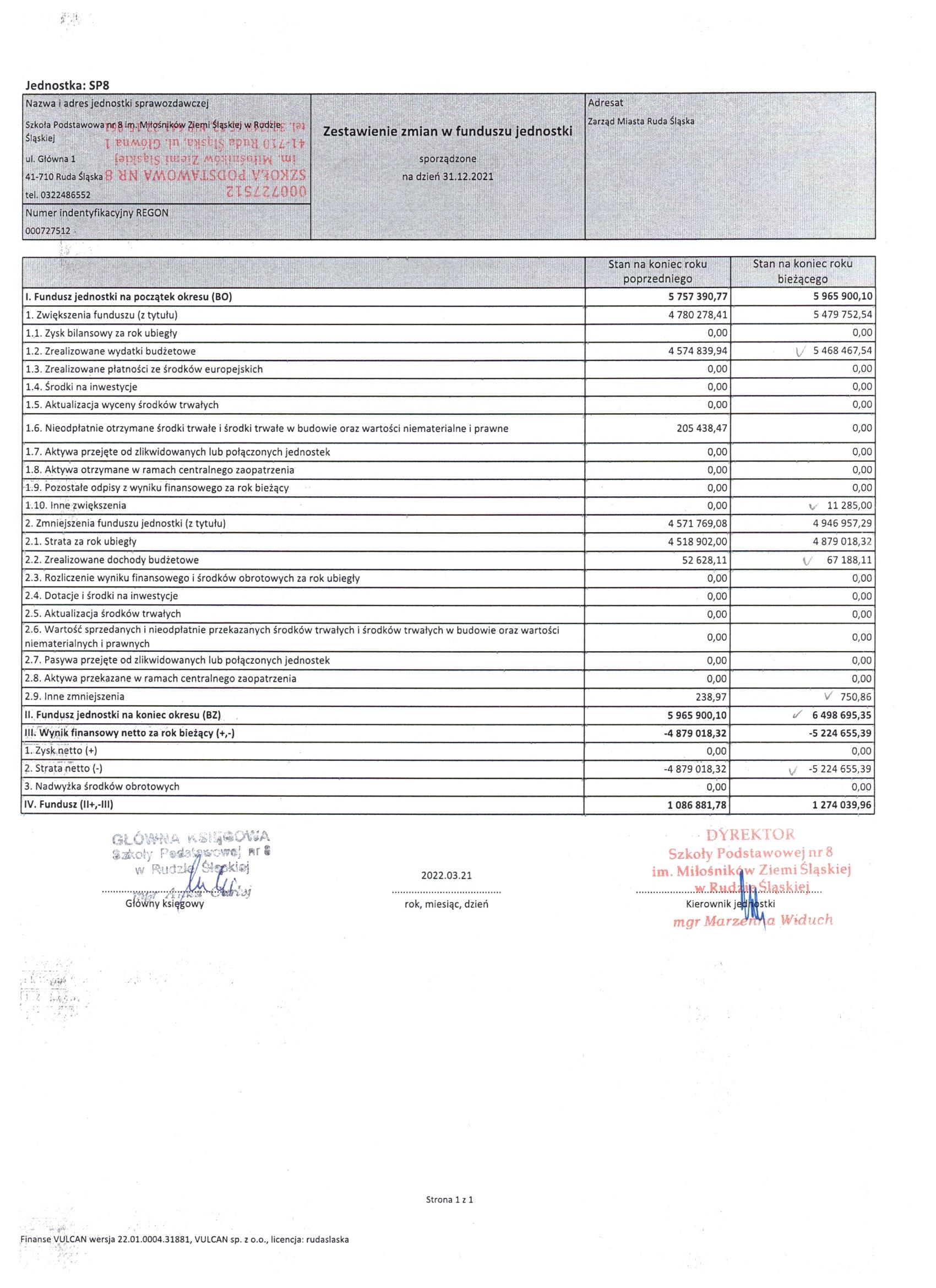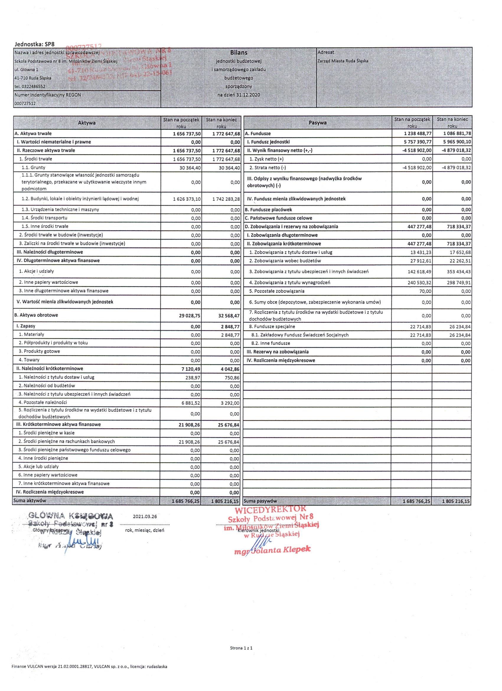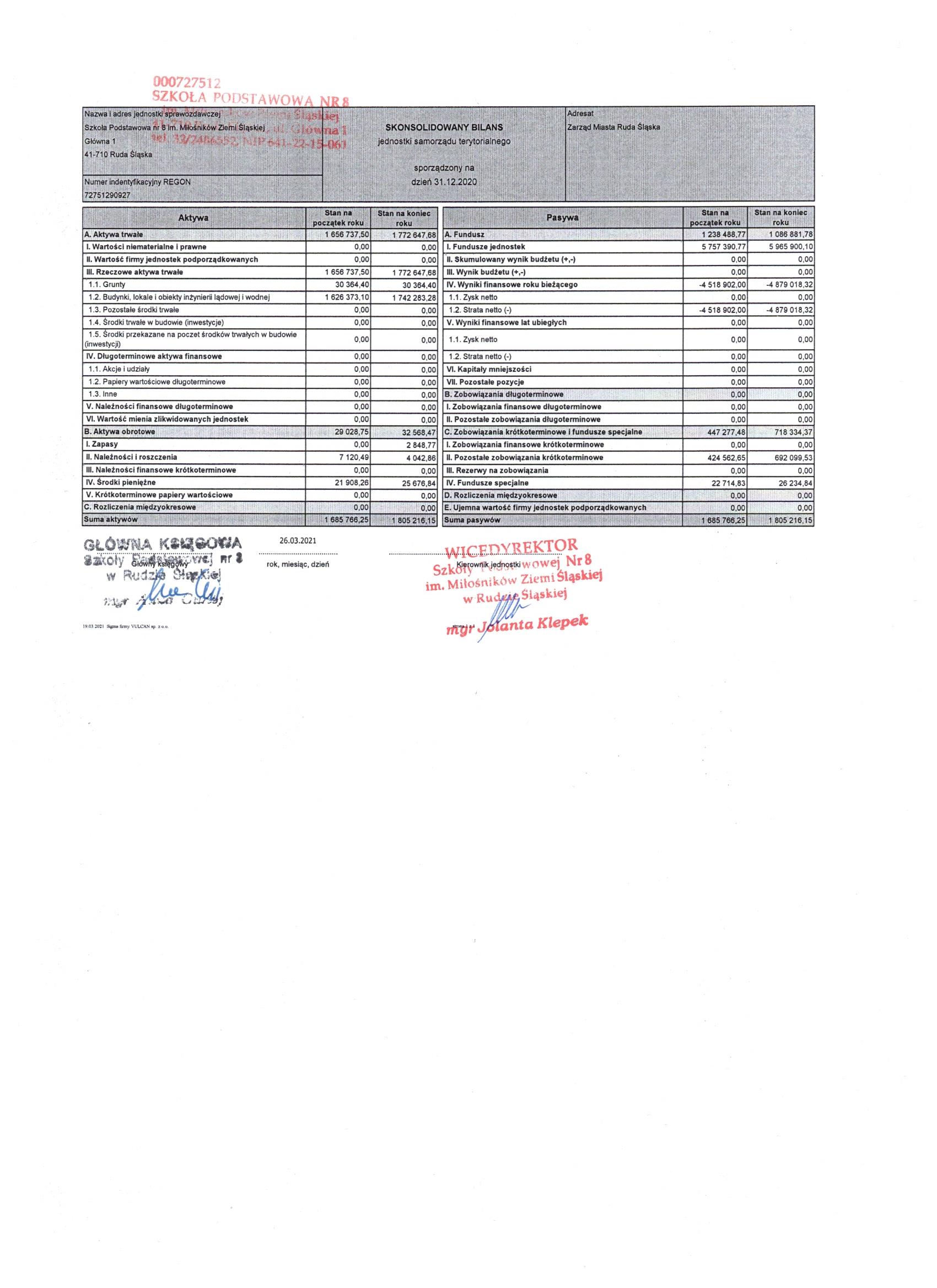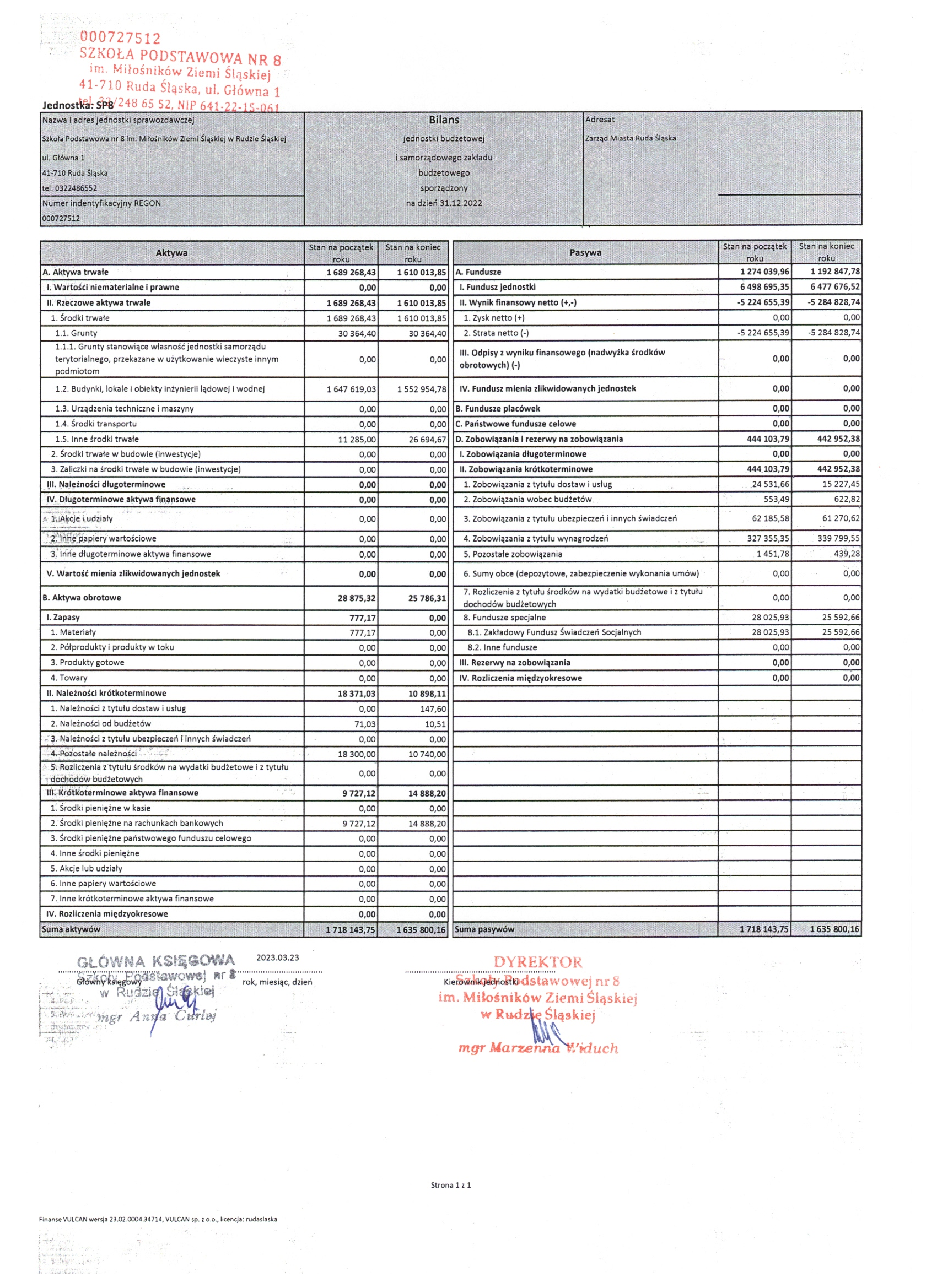 Sprawozdanie finansowe za 2024 r.Utworzono: 13 maj 2025 | Poprawiono: 13 maj 2025 | Opublikowano: 13 maj 2025 | Marzenna Widuch | Drukuj | E-mail | Odsłony: 299 Sprawozdanie finansowe za 2024 r. (...) Załączniki: Bilans jednostki budżetowej.pdf[ ]950 kB2025-05-13 06:34 Informacja_dodatkowa_za_rok_2024__Szkola_Podstawowa_Nr_8.pdf[ ]265 kB2025-05-13 06:34 Rachunek zysków i strat.pdf[ ]659 kB2025-05-13 06:34 Skonsolidowany bilans.pdf[ ]480 kB2025-05-13 06:34 Zestawienie zmian w funduszu jednostki.pdf[ ]551 kB2025-05-13 06:34