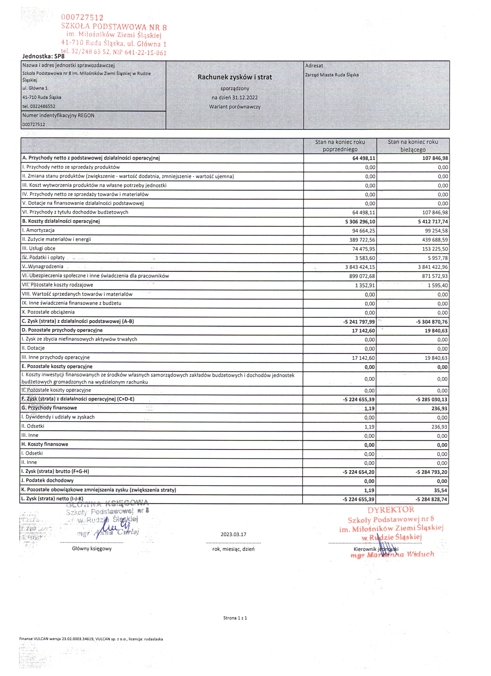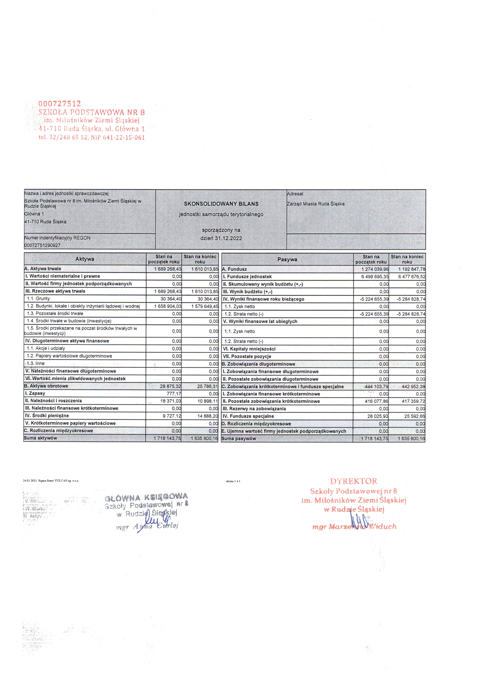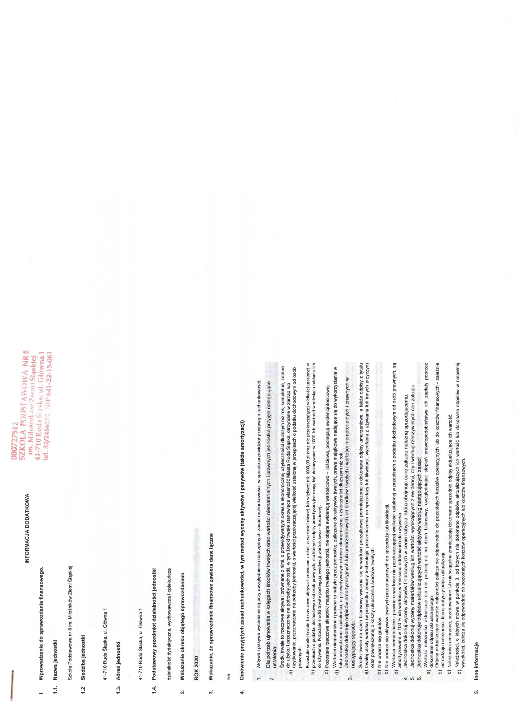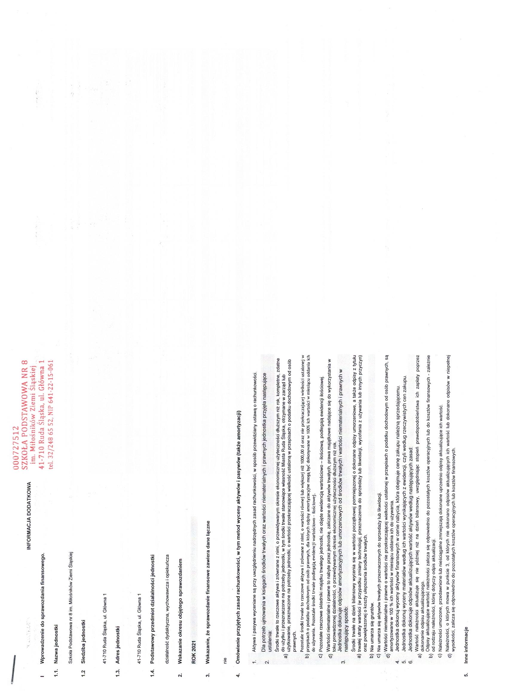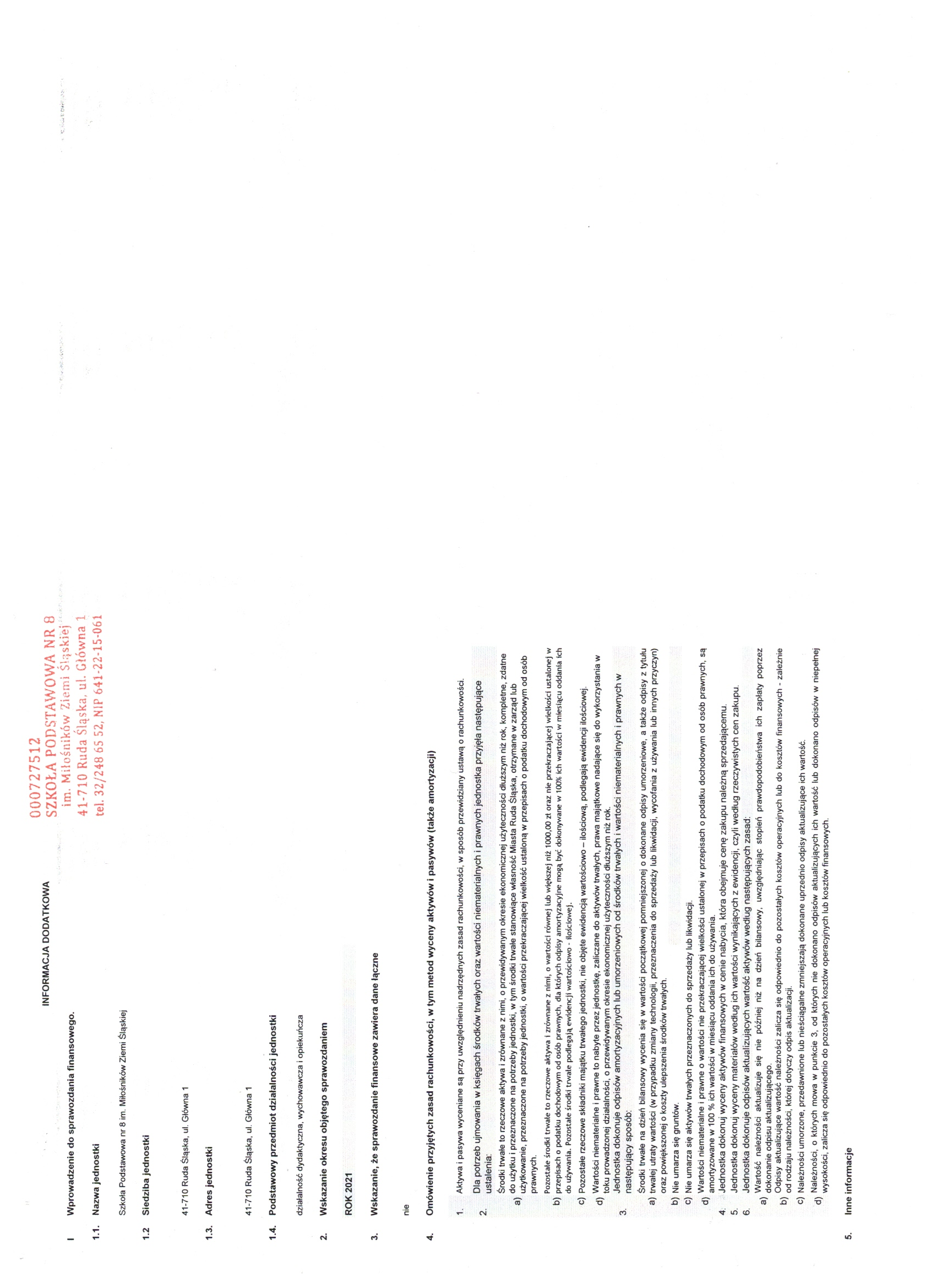 Sprawozdanie finansowe za 2023 r.Utworzono: 09 maj 2024 | Poprawiono: 09 maj 2024 | Opublikowano: 09 maj 2024 | Jolanta Klepek | Drukuj | E-mail | Odsłony: 539 Sprawozdanie finansowe za 2023 r. (...) Załączniki: Skan_20240508.pdf[ ]4231 kB2024-05-09 18:25 Skan_20240508 (2).pdf[ ]4029 kB2024-05-09 18:25 Skan_20240508 (3).pdf[ ]3605 kB2024-05-09 18:25 Skan_20240508 (4).pdf[ ]2697 kB2024-05-09 18:25 Informacja dodatkowa__Szkoła Podstawowa Nr 8.pdf[ ]344 kB2024-05-09 18:26